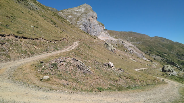 Esta segunda mitad nos recibe de la manera más brusca posible, con un largo tramo cercano al kilómetro y que en todo momento se mueve entorno al 18% de pendiente. Coincide además que por momentos el piso es algo irregular en ese tramo, por lo que echar pie a tierra en esa durísima rampa no es tan difícil. Tras pasar ese muro la pendiente se normaliza llegando a Pietramula, una pequeña zona de acampada al paso del GR-11. Como dato importante, en el entorno de Pietramula es la única zona por la que bajan varios arroyos en los que poder coger agua. También marca el punto en el que va cogiendo tintes de gran puerto. Alguna zona de roca con aspecto épico y amplias praderas alpinas nos acompañarán hasta el final. También un refugio y el cautivador paso por las antiguas Minas de Parzán y las Casas de Ruego. El trazado es duro, por momentos muy duro, alternando pequeños descansos con rampas endemoniadas y una pista en general en un estado decente pero que en puntos concretos empeora ligeramente para complicar el avance. A lo lejos se adivina un final que parece que nunca va a llegar. La altitud también entra en juego, no es que cueste respirar pero hace que todo sea más duro. Tras varios zig-zags se acaba la pista a casi 2.600 metros, también el sufrimiento. Poco más arriba está la cima de Punta Liena a 2.608 metros. Un merecido regalo para la vista con la norte de Monte Perdido (3.355 m) al fondo y al cual se puede llegar con la bicicleta tras haber vencido a este monstruo pirenaico.